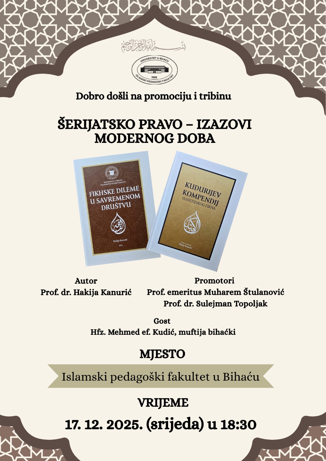 Na Islamskom pedagoškom fakultetu u Bihaću u srijedu, 17. decembra 2025. godine, s početkom u 18.30 sati, bit će održana promocija dviju knjiga na kojima je radio prof. dr. Hakija Kanurić, vanredni profesor Islamskog pedagoškog fakulteta u Bihaću i ujedno tribina o šerijatsko-pravnim izazovima modernog doba.Kad su u pitanju knjige, riječ je o prijevodu kapitalnog djela hanefijske pravne škole Kudurijev kompendij te o njegovom autorskom djelu iz oblasti šerijatskog prava pod naslovom Fikhske dileme u savremenom društvu. Promotori i izlagači, pored autora dr. Kanurića, bit će prof. dr. Muharem Štulanović i prof. dr. Sulejman Topoljak. Prigodnim uvodnim obraćanjem prisutnima će se obratiti muftija bihaćki hafiz Mehmed-ef. Kudić.