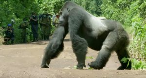 Kamerman je snimao gorilu kako izlazi na put i zaustavlja saobraćaj,...
