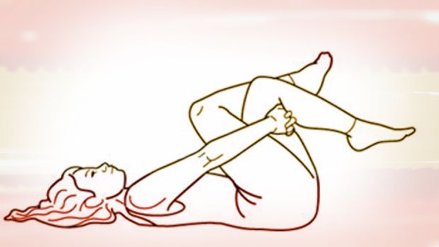 Opet, u ležećem položaju, savijte noge u koljenima i polako ih povucite ka grudima, ne odvajajući zadnjicu od poda. Prekrstite noge, kao što je pokazano na slici, i uhvativši rukama zdravu nogu, povucite je.