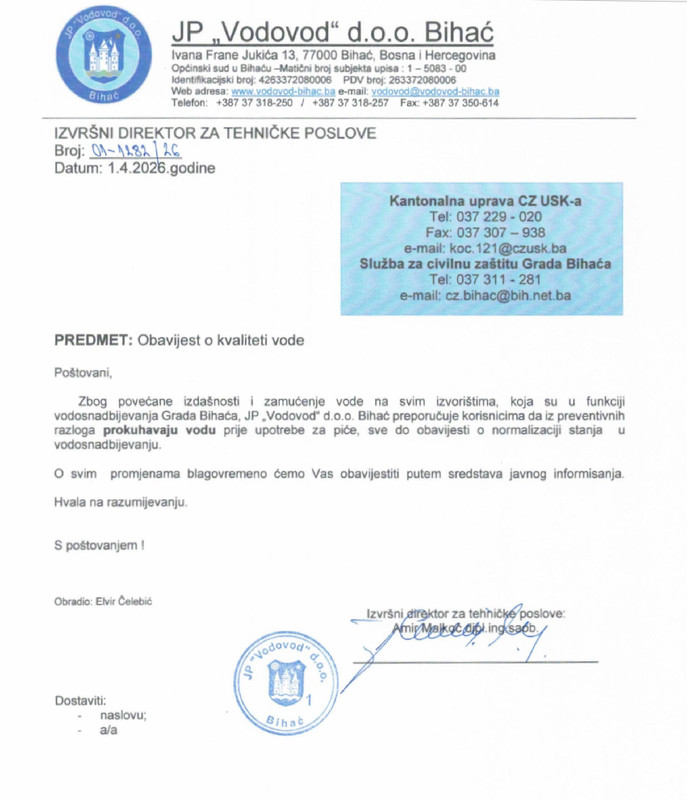 Nakon skoro dvije sedmice bez ažuriranih i vidljivih informacija o kvaliteti vode, JP „Vodovod“ d.o.o. Bihać konačno se oglasio – ali tek 1. aprila, uz preporuku građanima da vodu prije upotrebe prokuhavaju.