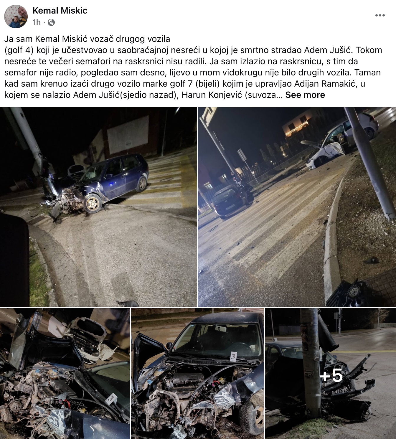 Nakon tragične saobraćajne nesreće u kojoj je život izgubio 22-godišnji Adem Jušić, oglasio se Kemal Miskic, vozač drugog vozila koje je učestvovalo u nesreći. U svojoj objavi na društvenim mrežama, Miskic je iznio detalje s mjesta nesreće i tok događaja prema svojoj perspektivi.